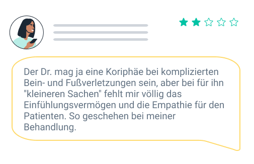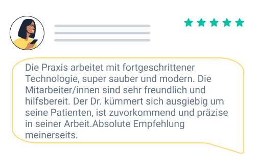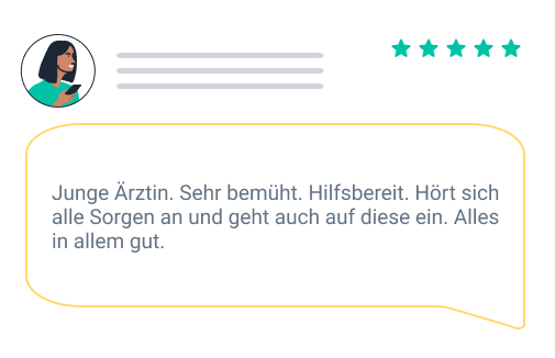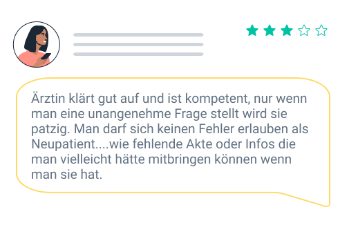 Nicht erlaubt: Bitte schreiben Sie keine Bewertung, wenn Sie dafür einen Anreiz oder einen anderen Vorteil (Gutschein, Rabatt etc.) von Seiten der Ärzt:innen angeboten bekommen haben. Diese Bewertungen werden nicht veröffentlicht. Vermeiden Sie verallgemeinernde Aussagen, die auf dem basieren, was Ihnen eine andere Person erzählt hat oder was Sie in den Medien gelesen haben.
